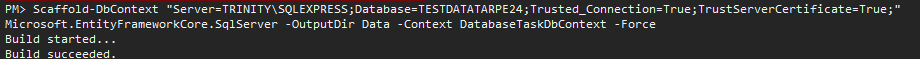 Scaffold-DbContext “Server=TRINITY\SQLEXPRESS;Database=TESTDATATARPE24;Trusted_Connection=True;TrustServerCertificate=True;” Microsoft.EntityFrameworkCore.SqlServer -OutputDir Data -Context DatabaseTaskDbContext -Force