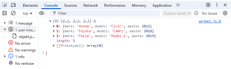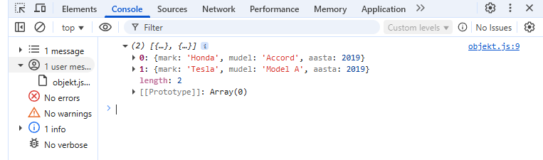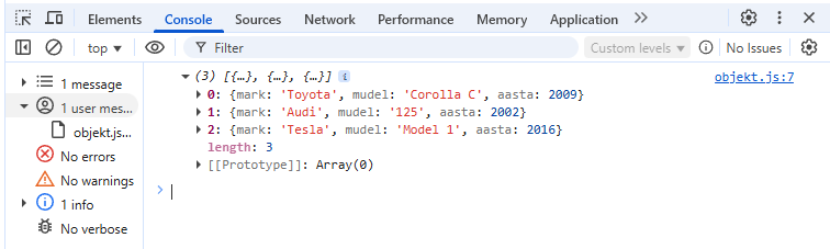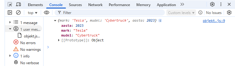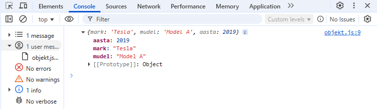 { mark: 'Tesla', mudel: 'Model 1', aasta: 2016 }