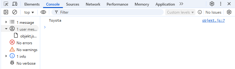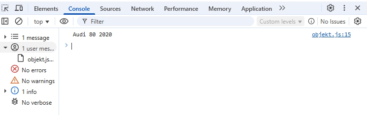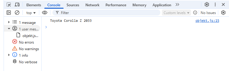 Console.log(auto.taisnimi()) laseb teada et kasutada taisnimi funktsiooni et saada consooli vastus, antud juhul laseb teada et tagastada auto mark, mudel ja aasta