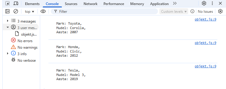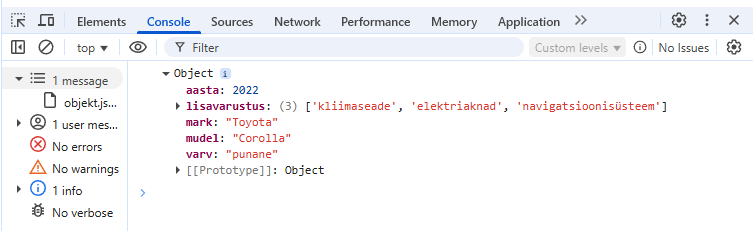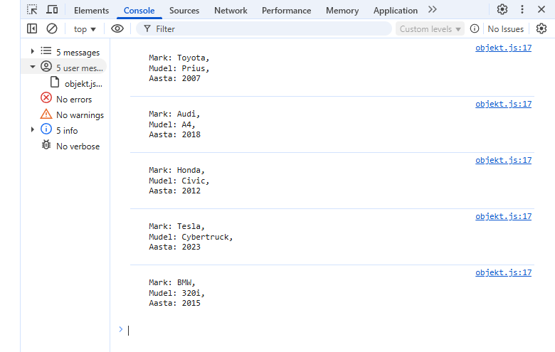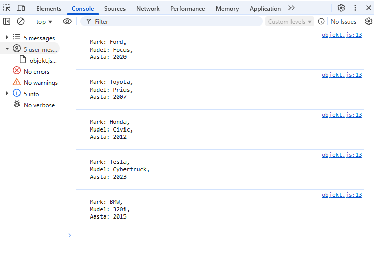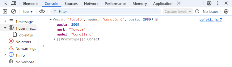 { mark: 'Toyota', mudel: 'Corolla', aasta: 2007 },
